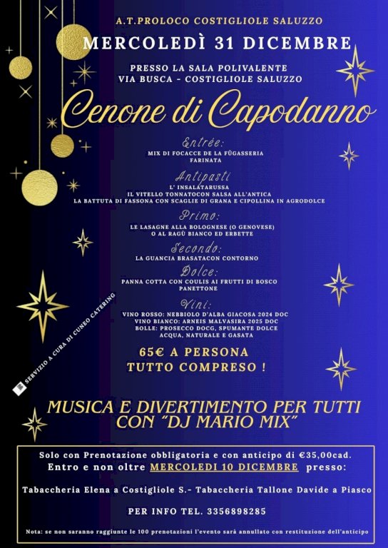 La serata sarà accompagnata dalla musica di Mario Mix, dj costigliolese che proporrà brani adatti a tutto il pubblico in salaDopo tanti anni ritorna a Costigliole Saluzzo il Cenone di Capodanno. Ai tempi delle famose “Casermette”, per anni adibite a salone delle feste, la Pro Loco organizzava regolarmente il cenone di fine anno. Con la demolizione del complesso e la successiva costruzione del Salone Polivalente l’iniziativa aveva dovuto interrompersi, ma ora viene riproposta con un appuntamento pensato per riportare la comunità a festeggiare insieme.