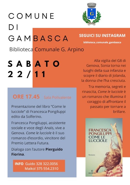 Appuntamento previsto per sabato 22 novembre alle ore 17.45, con la partecipazione dell'autrice Francesca PongiluppiSabato 22 novembre, alle 17.45, la Biblioteca Comunale Giovanni Arpino di Gambasca ospita un appuntamento nella sala polivalente: Francesca Pongiluppi presenta il suo romanzo “Come le lucciole” (Solferino editore).