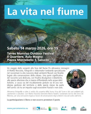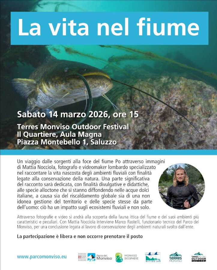 Appuntamento a Saluzzo sabato 14 marzo con una conferenza che esplora la biodiversità fluviale e il problema delle specie alloctoneSabato 14 marzo alle ore 15, a Il Quartiere di Saluzzo (piazza Montebello 1) e nell'ambito del Terres Monviso Outdoor Festival, si svolge “La vita nel fiume”, una conferenza organizzata dal Parco del Monviso nella quale si propone un viaggio dalle sorgenti alla foce del fiume Po attraverso immagini di Mattia Nocciola, fotografo e videomaker lombardo specializzato nel raccontare la vita nascosta degli ambienti fluviali con finalità legate alla conservazione della natura. L’appuntamento è inserito nel calendario della formazione per giornalisti e garantisce ai partecipanti 3 crediti. L'iscrizione si effettua da formazionegiornalisti.it.