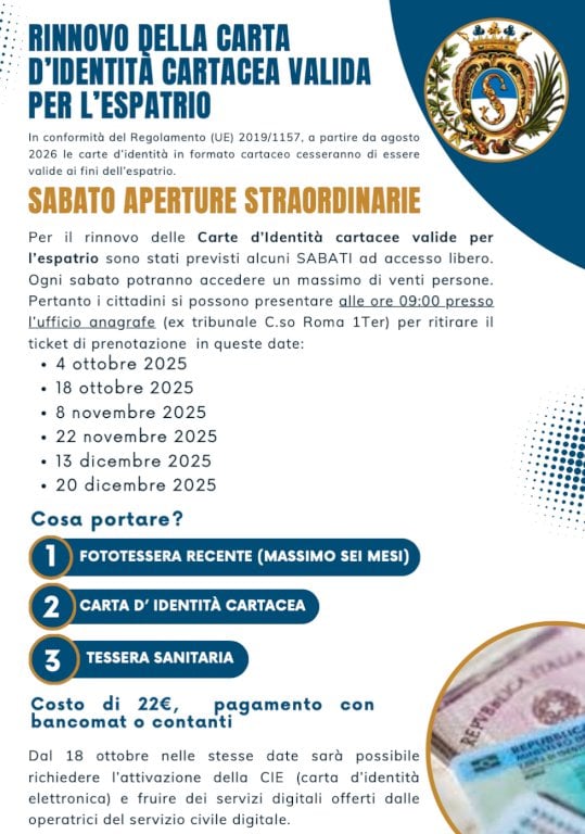 Il 13 e il 20 dicembre un’iniziativa rivolta a tutte le persone che devono richiedere il rilascio della Carta d’identità elettronica in vista della scadenza di quella cartaceaSono in programma sabato 13 dicembre e sabato 20 dicembre le ultime due aperture straordinarie “Open day Cie” per il 2025, organizzate dall’Ufficio anagrafe del Comune di Saluzzo, nella sede dell’ex tribunale, corso Roma 1/ter. L’obiettivo è facilitare il rilascio della Carta d’identità elettronica in vista dell’entrata in vigore di una legge del 2019 (numero 1157), che prevede che a partire dal 3 agosto 2026 le carte di identità cartacee non saranno più valide.