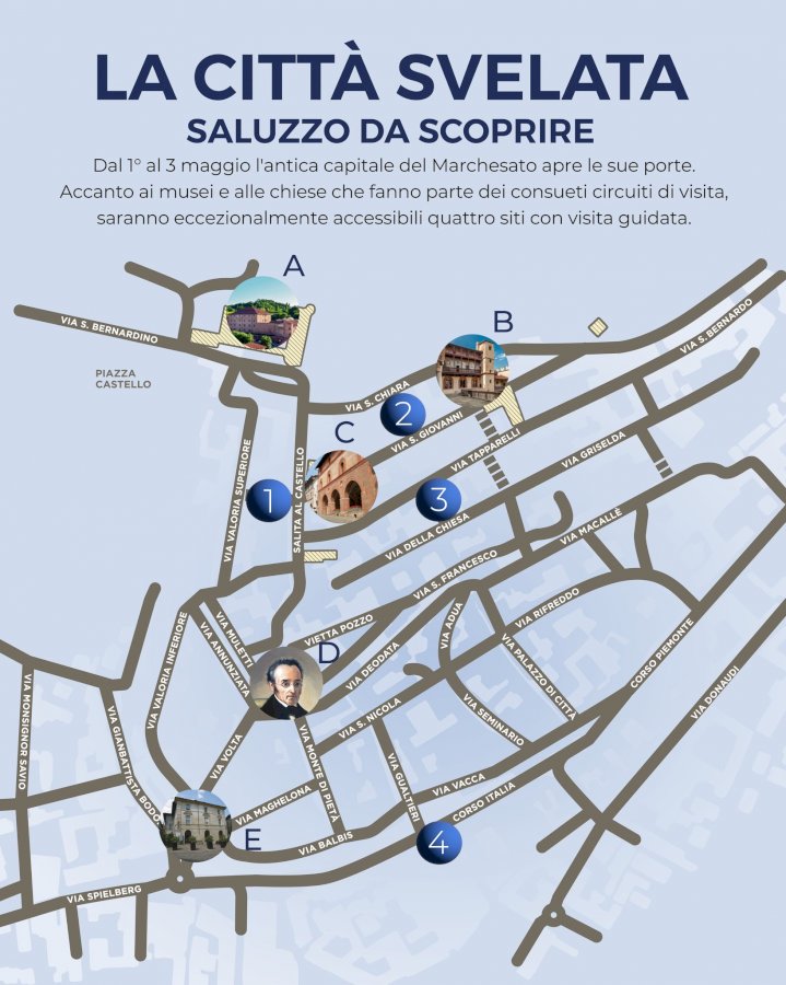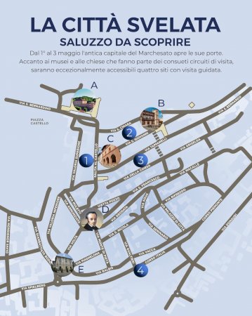 Quattro siti da scoprire: chiesa di San Giovanni, Cappella marchionale, la Casa bassa del Marchese e l'ex seminario di San NicolaL’esterno dell’abside della chiesa di San Giovanni, la Cappella marchionale, la Casa bassa del Marchese su Salita al Castello e l’ex seminario di San Nicola. Sono i quattro siti che saranno aperti eccezionalmente per “La città svelata – Saluzzo da scoprire”, all’interno della rassegna culturale “Start” nei pomeriggi di venerdì 1, sabato 2 e domenica 3 maggio 2026.