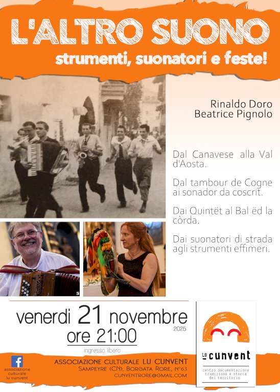 Appuntamento previsto per venerdì 21 novembre presso l'associazione culturale Lu CunventVenerdi 21 novembre alle ore 21 Rinaldo Doro e Beatrice Pignolo ci porteranno alla scoperta dell'"altro suono". Dal Canavese alla Val d'Aosta. Dal tambour de Cogne ai sonador da coscrit. Dai Quintët al Bal ëd la còrda. Dai suonatori di strada agli strumenti effimeri. Ingresso libero.