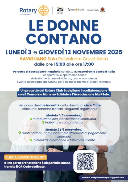 Lunedì 3 e giovedì 13 novembre due appuntamenti rivolti agli operatori che ogni giorno lavorano al fianco delle vittime di violenza, anche economicaPrende avvio a novembre “Le donne contano”, un progetto di educazione finanziaria rivolto a operatrici e operatori che ogni giorno lavorano al fianco delle donne vittime di violenza, anche economica. L’iniziativa, promossa dal Rotary Club Savigliano in collaborazione con il Consorzio Monviso Solidale e l’associazione Mai+Sole, con il patrocinio del Comune di Savigliano, propone due incontri formativi condotti da esperti della Banca d’Italia - sede di Torino: la dottoressa Marilena Merlino e il dottore Roberto Traini.