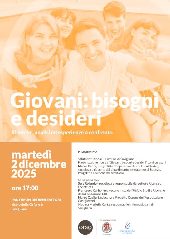 Il programma prevede, dopo i saluti dell'amministrazione comunale, la presentazione ricerca "Giovani: bisogni e desideri" con i curatori Marco Canta, progettista Cooperativa Orso e Luca Davico, sociologo e docente del dipartimento interateneo di Scienze, Progetto e Politiche del territorio. A seguire se ne parlerà con Sara Rolando - sociologa e responsabile del settore Ricerca di Ecclettica+, Francesco Carbonero - economista dell'Ufficio Studi e Ricerche della Fondazione CRC e Marco Caglieri, educatore Progetto Oceano dell'Associazione Oasi giovani