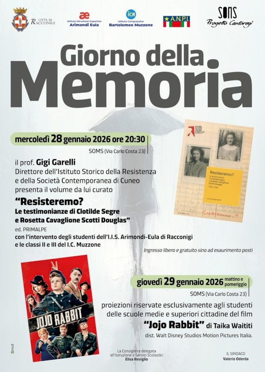 Gli eventi sono stati realizzati grazie alla collaborazione con l’Istituto Arimondi-Eula, l’I.C. Bartolomeo Muzzone, l’Anpi e l’associazione Progetto CantoregiIn occasione del Giorno della Memoria 2026, il Comune di Racconigi propone due appuntamenti con l’obiettivo di ricordare e far riflettere sulla tragedia che è stata la Shoah. Gli eventi sono stati realizzati grazie alla collaborazione con l’Istituto Arimondi-Eula, l’I.C. Bartolomeo Muzzone, l’ANPI e l’associazione Progetto Cantoregi.