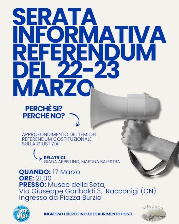 Il 17 marzo al Museo della Seta un incontro informativo sulle ragioni del sì e del no, in vista del voto del 22–23 marzoIl Tocca a Noi organizza una serata informativa dedicata al referendum costituzionale sulla giustizia, in programma martedì 17 marzo alle ore 21 presso il Museo della Seta, in via Giuseppe Garibaldi 3 (ingresso da piazza Burzio) a Racconigi.