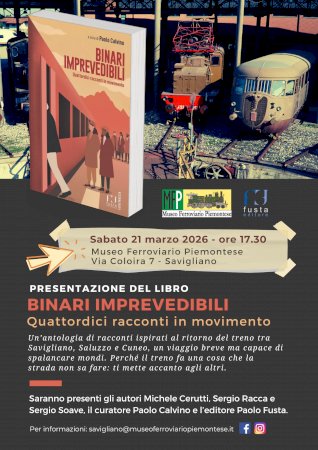 Appuntamento previsto per il 21 marzo alle 17.30. Quattordici racconti in movimento nello spazio e nel tempo, con sottofondo il suono caratteristico dei treniSabato 21 marzo alle ore 17.30 il Museo Ferroviario Piemontese ospita la presentazione del libro Binari imprevedibili. Quattrodici racconti in movimento, antologia di racconti curata da Paolo Calvino e pubblicata da Fusta Editore. All’incontro saranno presenti gli autori saviglianesi Michele Cerutti, Sergio Racca e Sergio Soave, il curatore Paolo Calvino e l’editore Paolo Fusta.