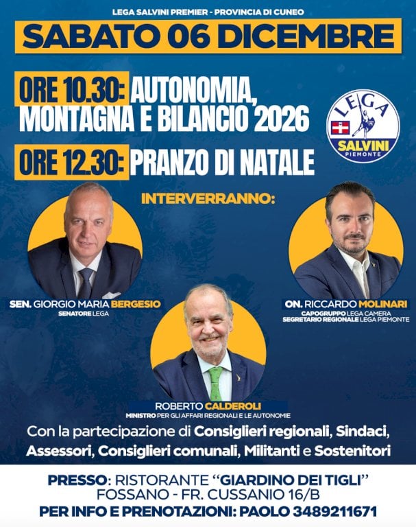 Spiega il Senatore Bergesio: "Il 6 dicembre a Fossano sarà un momento per affrontare temi che sono il cuore pulsante della nostra azione politica. Autonomia, montagna e legge di bilancio 2026 non sono semplici parole, ma le chiavi per garantire maggiore crescita, responsabilità e attenzione alle specificità del nostro Piemonte e della provincia di Cuneo in particolare. Invito tesserati, simpatizzanti e amministratori locali a partecipare numerosi per confrontarci e disegnare insieme il futuro del nostro territorio”.