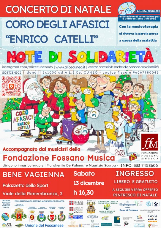 Appuntamento a Bene Vagienna il 13 dicembre per l'evento gratuito che riunisce la Granda attorno alle persone colpite da ictusSabato 13 dicembre, alle 16.30, il Palazzetto dello Sport di Bene Vagienna (viale Rimembranza, 2) ospita il concerto natalizio del Coro degli Afasici “Enrico Catelli” di A.L.I.Ce. Cuneo OdV-ETS, accompagnato dai musicisti della Fondazione Fossano Musica. L’ingresso è libero e gratuito e, al termine, sarà offerto un rinfresco di Natale. Un appuntamento che richiama l’intera provincia: il coro riunisce infatti persone con afasia post-ictus provenienti da tutte le “Sette Sorelle” della Granda. L’afasia è la perdita della parola dovuta all’ictus, prima causa di disabilità nel territorio.