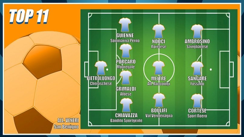 In attacco pochi dubbi per il ruolo di centravanti, che spetta a Salif Sangare, autore di una splendida doppietta con cui ha trascinato il Fossano (Eccellenza) al successo di Pinerolo. Insieme a lui lo scatenato Davide Ambrosino, protagonista assoluto della goleada della Saviglianese (Promozione) sul campo del Moretta capolista, a cui ha contribuito con due reti. La terza casella del reparto offensivo è occupata dal capocannoniere del girone F di Seconda Categoria Marco Cortese, in gol due volte nel poker dello Sportroero con il Castiglione.