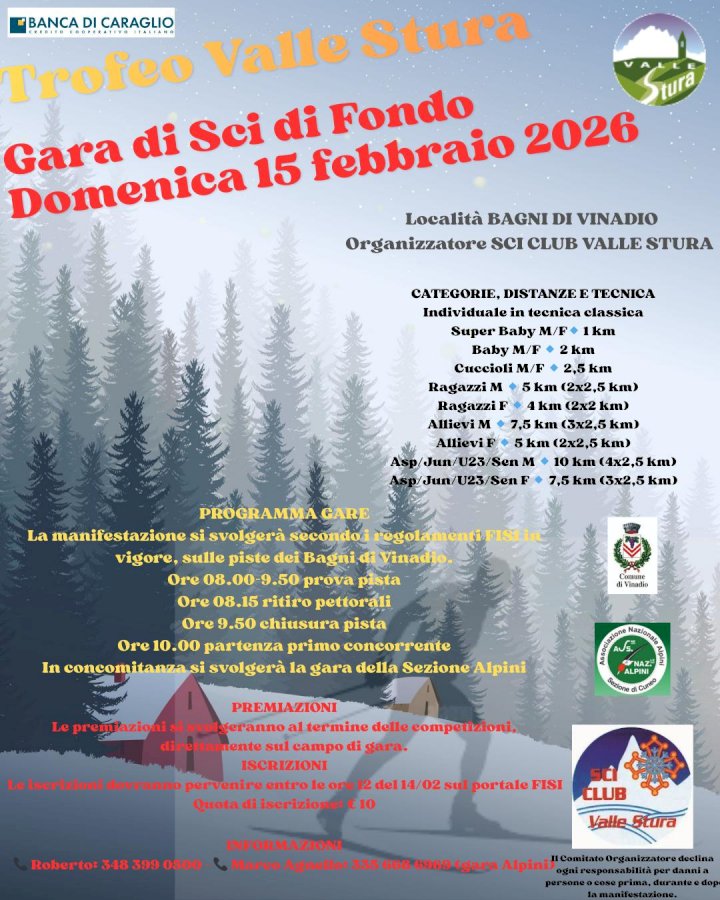 La gara inserita nel calendario del circuito regionale è organizzata dallo Sci Club omonimoIl calendario del circuito regionale dello sci nordico propone per domenica 15 febbraio il Trofeo Valle Stura, organizzato dallo Sci Club omonimo in collaborazione con il Comune di Vinadio e la Sezione Alpini di Cuneo. La gara è aperta a tutte le categorie della FISI e alle sezioni dell’Associazione Nazionale Alpini. Saranno in gara nell’Individuale a tecnica classica tutte le categorie FISI e nella Mass Start a tecnica libera gli iscritti alla Sezione Alpini di Cuneo. Le distanze della gara a tecnica classica sono di 1 km per i Super Baby; 2 km per i Baby; 2,5 km per i Cuccioli; 4 km per le Ragazze; 5 km per i Ragazzi e per le Allieve; 7,5 km per gli Allievi, le Aspiranti, le Juniores, le Under 23 e le Seniores; 10 km per gli Aspiranti, Juniores, Under 23 e Seniores. Il ritiro dei pettorali sarà possibile a partire dalle 8,15. Dalle 8 alle 9,50 sarà possibile provare la pista e il primo concorrente partirà alle 10. Le premiazioni sono in programma al termine delle competizioni sul campo di gara. Le iscrizioni si ricevono online entro le 12 di sabato 14 febbraio tramite il portale https://online.fisi.org.