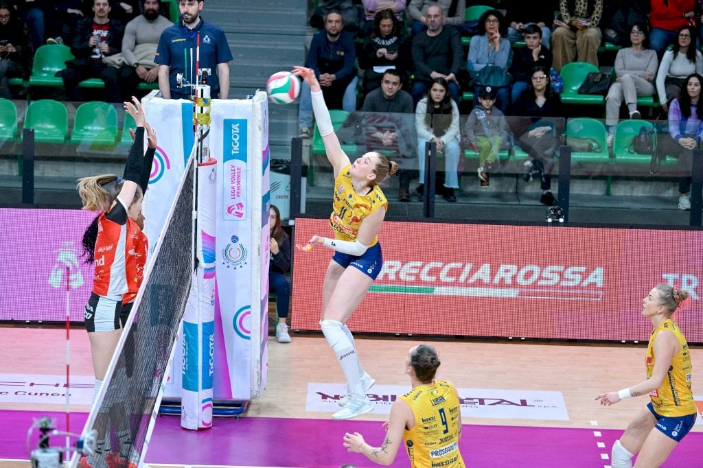 La doppia murata vincente di Lubian sorprende le Gatte, con le venete che si portano sul 3-0 con Sillah. Solo Conegliano in campo in questa fase, con Lubian che colpisce anche in primo tempo e Salvagni che chiama timeout. Koulisiani in fast inaugura il tabellino per le Gatte, ma il suo successivo muro si spegne out. Diop firma il 2-5, ma subito dopo Wolosz è geniale nel pescare Haak, che mette a terra un attacco dei suoi. Una girandola di servizi sbagliati aggiorna il punteggio sul 4-8, quando Chirichella stoppa a muro Keene lanciata in fast. Conegliano doppia le Gatte sul 10-5, quando Allaoui trova di seconda il suo primo punto nell'incontro. Haak però è ingiocabile e riporta subito a 5 i punti di vantaggio per le sue. Le ospiti alzano ulteriormente il livello e si portano sul 15-7, complice una nuova murata mostruosa di Lubian che stimola Salvagni al timeout. Dopo un nuovo punto di Sillah, Salvagni inserisce Pritchard per Rivero. Sul 18-8 per Conegliano, Diop torna a colpire come sa, ma Daalderop le risponde immediatamente. Il copione si ripete identico anche negli scambi successivi, con Cuneo che prova ad imbastire una rimonta venendo però ogni volta sommersa dalla qualità delle giocate delle venete, che ottengono applausi a ripetizione da tutto il palazzetto. Daalderop firma l'ace del 23-10, e Atamah sbaglia la successiva fast. Il set si chiude subito dopo con il punto di Sillah. 10-25 e 2-0 Conegliano al Palazzetto di Cuneo.