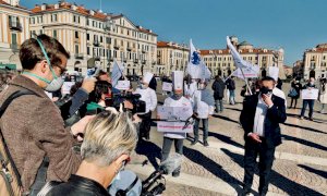 La protesta di baristi e ristoratori in piazza Galimberti a Cuneo contro il Dpcm per lanciare "un grido di dolore e un messaggio forte al Governo"