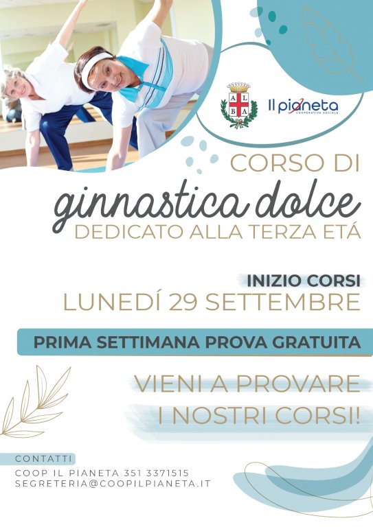 Dal 29 settembre tornano gli appuntamenti organizzati in molti Centri d’Incontro comunali, in collaborazione con la Cooperativa sociale “Il Pianeta”Da lunedì 29 settembre ripartono ad Alba i corsi di attività motoria – ginnastica dolce - dedicati alla terza età e organizzati in molti Centri d’Incontro comunali, in collaborazione con la Cooperativa sociale “Il Pianeta”.