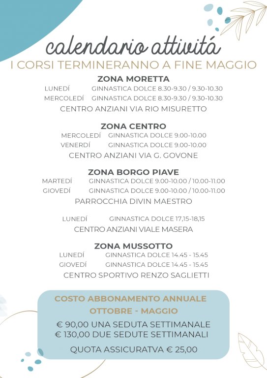 giovedì Ginnastica dolce: 9 – 10; 10 – 11.