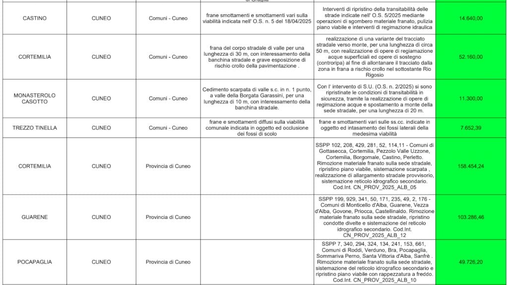 Ai Comuni della provincia di Cuneo sono attribuite risorse per quattro interventi, Castino, Cortemilia, Monasterolo Casotto e Trezzo Tinella per circa 86.000 euro, mentre alla Provincia di Cuneo sono stati assegnati circa 311.000 euro per tre interventi sulle strade provinciali a Cortemilia, Guarene e Pocapaglia.