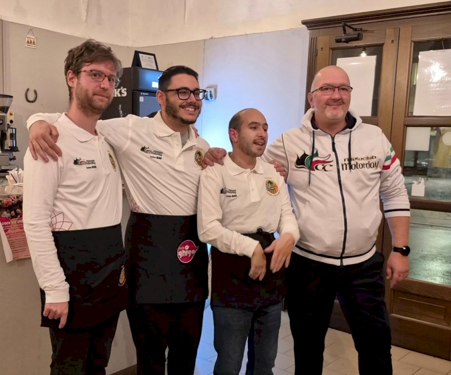 Nella serata di venerdì 7 novembre, una delegazione della nostra Sezione di Alba del CCMotorday capeggiati dal capo sezione Massimo Rainero, dallo scrivente ed alcuni soci del motoclub si è recata a Carmagnola nel locale in questione, dove era presente la vice presidente, responsabile dei laboratori dell’associazione, Antonella Cavallini ed i ragazzi intenti al servizio e sono state consegnate le polo ai ragazzi presenti, che felicissimi hanno indossato immediatamente le nuove divise e hanno continuato a servire i clienti presenti nel locale, compresa la delegazione.