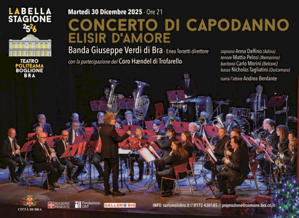 Il 30 dicembre con la Banda Giuseppe Verdi di Bra e il Coro Hændel di TrofarelloQuale migliore tradizione, per dare il benvenuto al nuovo anno, se non la musica? Un appuntamento atteso che, anche quest’anno, torna nel calendario del teatro Politeama Boglione di Bra: martedì 30 dicembre, alle ore 21, va in scena il “Concerto di Capodanno - Elisir d'Amore”, con la Banda “Giuseppe Verdi” di Bra diretta da Enea Tonetti e la partecipazione del Coro Hændel di Trofarello.