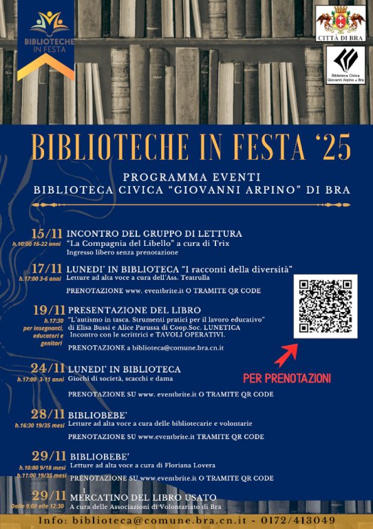 Tanti eventi per i giovani di tutte le età dal 15 al 29 novembrePer il terzo anno consecutivo la biblioteca civica “Giovanni Arpino” di Bra prende parte al progetto “Biblioteche in festa” curato dalle associazioni Progetto Cantoregi e Terre dei Savoia con l’obiettivo di promuovere la lettura e sensibilizzare sul ruolo delle biblioteche nel tessuto sociale delle realtà del territorio. In programma un fitto cartellone di iniziative nel periodo compreso tra il 15 e il 29 novembre 2025.