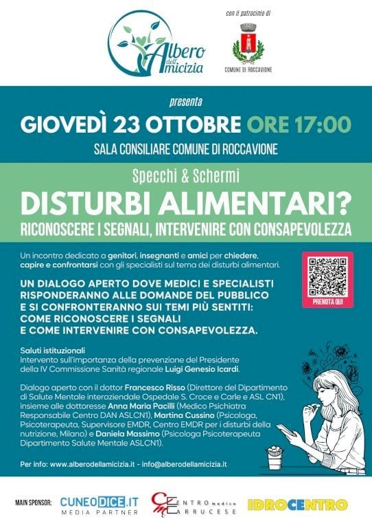 Alle ore 17 nella sala consiliare un nuovo incontro del ciclo "Specchi&Schermi" organizzato da "L'Albero dell'Amicizia"Questa sera, giovedì 23 ottobre alle ore 17, il Comune di Roccavione e “L’Albero dell’Amicizia”, invitano famiglie, insegnanti e cittadini al primo appuntamento del ciclo “Specchi & Schermi”, dedicato a capire e riconoscere i segnali dei disturbi alimentari in adolescenti e preadolescenti e a come intervenire con consapevolezza. Un’opportunità unica per la popolazione che desidera essere informata e fugare qualsiasi dubbio su temi di sicuro interesse e molto importanti per tutte le famiglie. Anche in forma anonima, il pubblico potrà porre domande agli esperti del Dipartimento di Salute Mentale. L'incontro si svolgerà alle 17 presso la Sala Consiliare.
