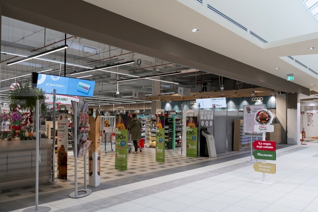 Una delle principali novità riguarda il trasferimento della parafarmacia e dell’ottica all’interno dell’area vendita, dove compongono un unico percorso dedicato al benessere e alla cura della persona. La scelta risponde alle esigenze dei clienti e replica un modello già sperimentato con successo in altri punti vendita: la possibilità di accedere a questi servizi durante la spesa, senza uscire dall’ipermercato, consente di ottimizzare i tempi ed evita code o spostamenti tra aree differenti della struttura. Gli spazi precedentemente occupati dalla parafarmacia sono ora destinati a Novapoint e Spazio Soci, collocati in galleria di fronte all’ingresso principale con un’area rinnovata e più accogliente.