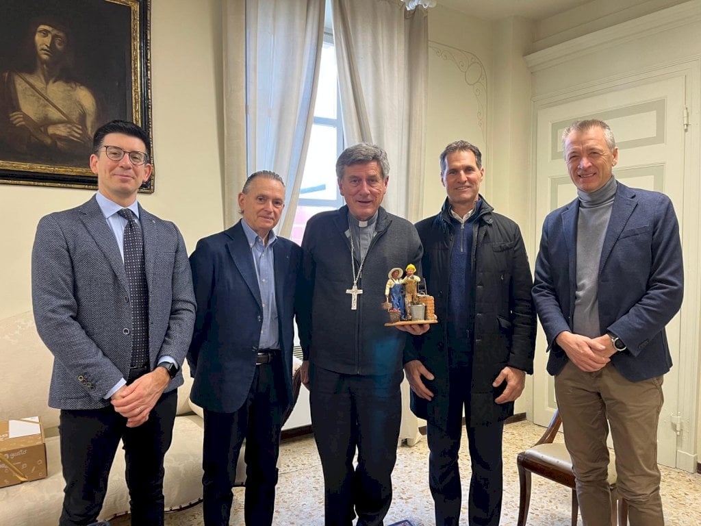 Questa mattina, 12 dicembre, Valerio Romana, presidente Confartigianato Zona Cuneo, Joseph Meineri, direttore generale Confartigianato Cuneo, Paolo Quaranta, presidente Coldiretti Zona Cuneo e Massimo Meineri, segretario Coldiretti Zona Cuneo, hanno consegnato la prima statuina al vescovo di Cuneo e Fossano Mons. Piero Delbosco. A seguire, martedì 16 dicembre alle ore 9 avverrà la consegna al vescovo di Alba, Mons. Marco Brunetti, mercoledì 17 dicembre alle ore 11 al vescovo di Mondovì monsignore Egidio Miragoli e alle ore 14.30 al vescovo di Saluzzo monsignore Cristiano Bodo.