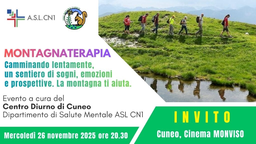 Una serata che nasce dalla collaborazione tra ProNatura Cuneo ed il Centro Diurno di Cuneo, si terrà il 26 novembreIl prossimo mercoledì 26 novembre, alle ore 20.30, presso il Cinema Monviso di Cuneo si terrà l’evento dal titolo “Montagnaterapia: Camminando lentamente un sentiero di sogni, emozioni e prospettive. La montagna ti aiuta!”