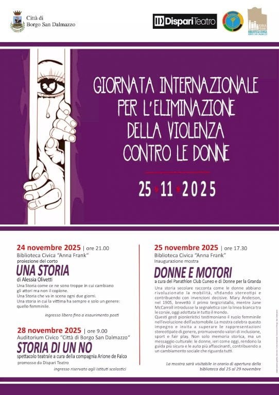 La città di Borgo San Dalmazzo aderisce alla Giornata Internazionale per l'Eliminazione della Violenza contro le Donne promuovendo una serie di iniziative.