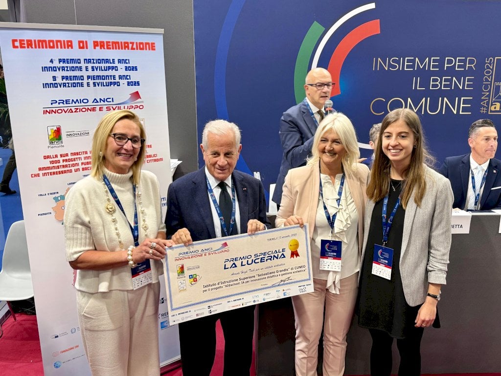 L’azienda cuneese, nell’ambito del Premio ANCI Innovazione & Sviluppo 2025, è stata per la prima volta promotrice di una sezione rivolta agli istituti scolasticiL’Istituto scolastico pubblico IIS “Sebastiano Grandis” di Cuneo si è aggiudicato la prima edizione del riconoscimento speciale La Lucerna Educational, all’interno del Premio ANCI Innovazione & Sviluppo 2025. L’azienda di Cuneo - leader nella fornitura di arredi e materiali per scuole -, è infatti da quest’anno partner del Premio ANCI sull’innovazione della pubblica amministrazione che ha visto nella giornata del 13 novembre la cerimonia di premiazione a Bologna, nella sala Leonardo Da Vinci. La sezione speciale La Lucerna era una delle novità dell’edizione 2025 del premio: un ulteriore tassello che ha permesso l’apertura delle candidature anche agli istituti scolastici di ogni ordine e grado mettendo in palio 10 mila euro in arredi innovativi di ultima generazione. La Lucerna Educational, realtà all’avanguardia su questo tipo di attrezzature, rappresentata a Bologna da Cinzia Longo, ha consegnato il premio alle docenti Eliana Lerda e Alda Lerda, a nome dell’istituto. Alla consegna ha partecipato anche il vice presidente ANCI e sindaco di Imperia, Claudio Scajola.
