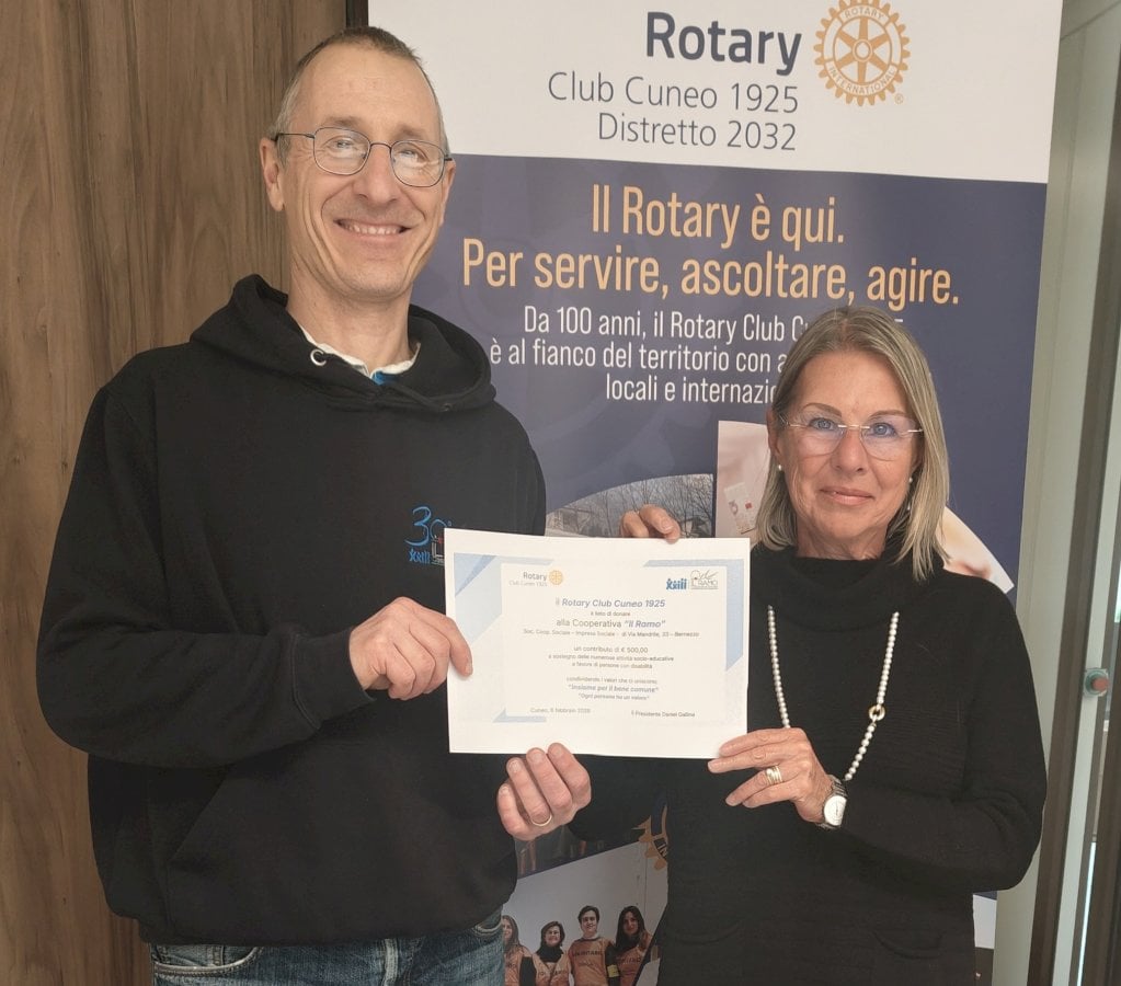 Il commento di Maria Gabriella Olivero, membro del Consiglio Direttivo: "Confermiamo la nostra attenzione alle realtà del territorio"Il Rotary Club Cuneo 1925, rappresentato dalla Dott.ssa Maria Gabriella Olivero, membro del Consiglio Direttivo, ha incontrato Luca Miglietti, Presidente della Cooperativa Sociale “Il Ramo”, per formalizzare una donazione di 500 euro a sostegno dei progetti educativi e inclusivi promossi dalla Cooperativa.