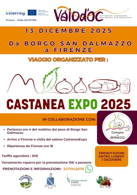 Un'opportunità per visitare il Salone Nazionale del Castagno il prossimo 13 dicembreL'Unione Montana Valle Stura, in qualità di Ente capofila del Progetto INTERREG ALCOTRA ValOd'OC, è lieta di annunciare l'organizzazione di un viaggio per visitare Castanea Expo 2025 a Firenze. L'iniziativa, realizzata con la collaborazione del Consorzio della Castagna di Bernezzo, è volta a promuovere l'aggiornamento professionale e a rafforzare il legame tra i produttori locali e il contesto nazionale.