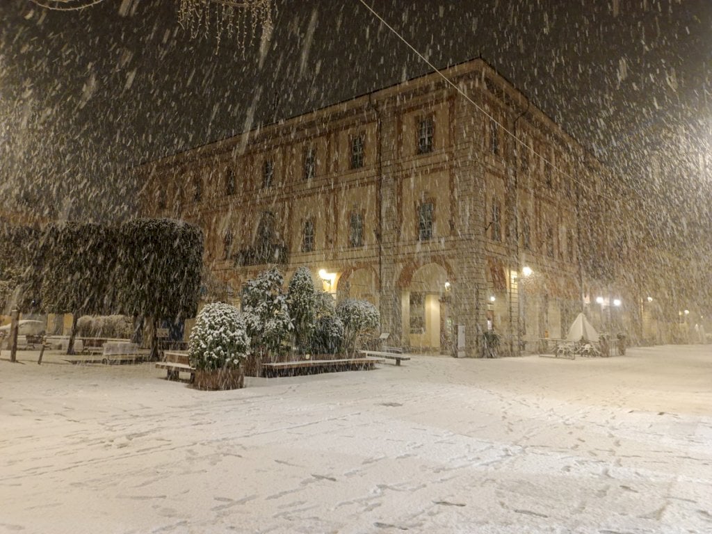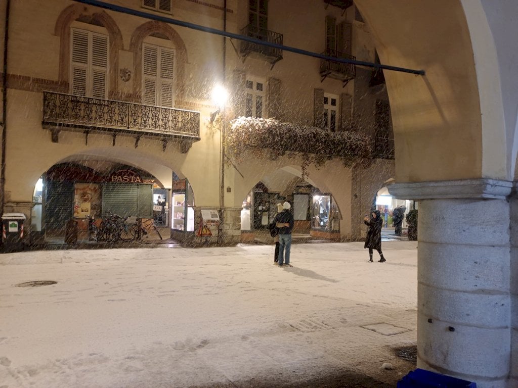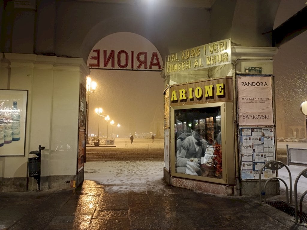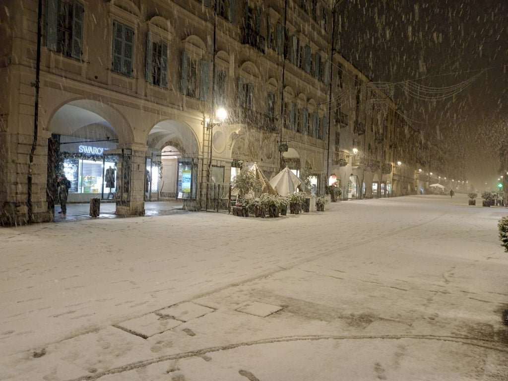 Uno spettacolo sempre meno frequente in Cuneo, tanto che ormai parecchi passanti lo immortalano coi propri telefoni cellulari. L’incanto della prima neve finisce instagrammato, qualcuno esce dai portici di via Roma per farsi fotografare stretto alla propria dolce metà, qualcun altro si scatta un selfie.