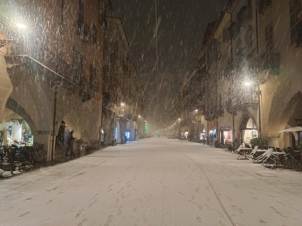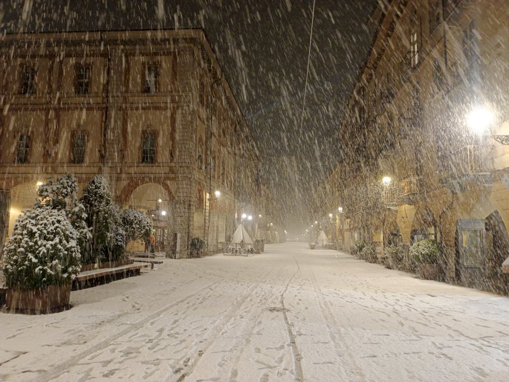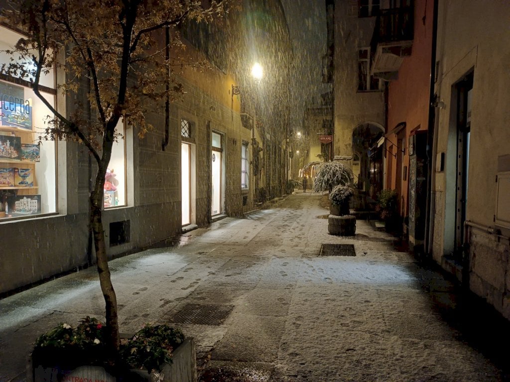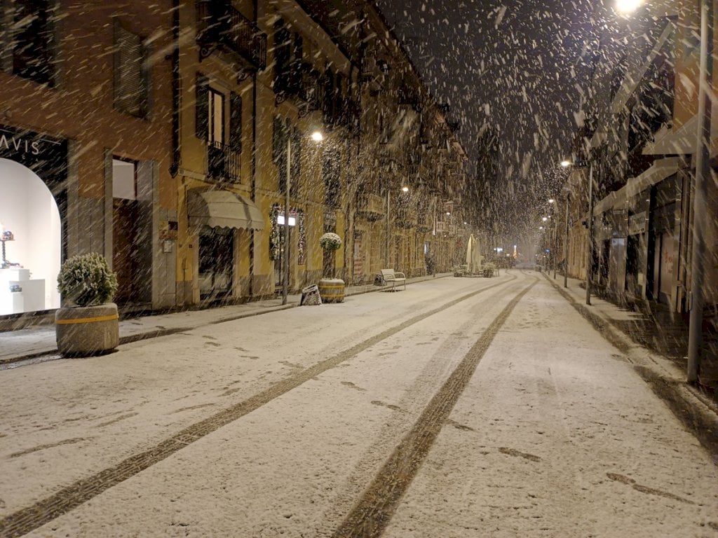 Uno spettacolo sempre meno frequente in Cuneo, tanto che ormai parecchi passanti lo immortalano coi propri telefoni cellulari. L’incanto della prima neve finisce instagrammato, qualcuno esce dai portici di via Roma per farsi fotografare stretto alla propria dolce metà, qualcun altro si scatta un selfie.