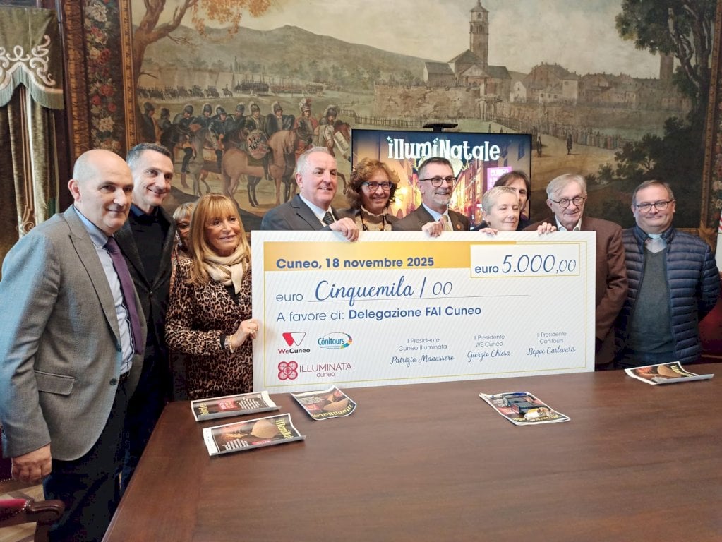 Durante la conferenza stampa di presentazione delle iniziative, è stato consegnato alla Delegazione FAI di Cuneo un assegno di 5 mila euro, ricavato della cena "Milleluci nel piatto" organizzata in luglio dall'Associazione Comitato Cuneo Illuminata, Associazione We Cuneo e Conitours. Il contributo sarà utilizzato per il recupero dei tendaggi verde speranza dell'unica camera da letto del Castello di Manta e per riaprire due finestre nel lato interno della corte, oggi murate.