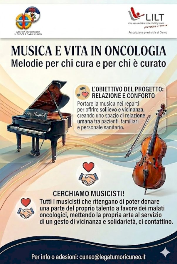 Il progetto partito dal Day Hospital Oncologico: "Vogliamo che diventi un'esperienza aperta, capace di mettere al centro la persona e la qualità umana del percorso di cura"Dopo il successo dell'inaugurazione e l'avvio delle prime collaborazioni artistiche, la LILT (Lega Italiana per la Lotta contro i Tumori) di Cuneo lancia un appello ufficiale alla comunità musicale locale. Il progetto “Musica e vita in oncologia: melodie per chi cura e per chi è curato”.