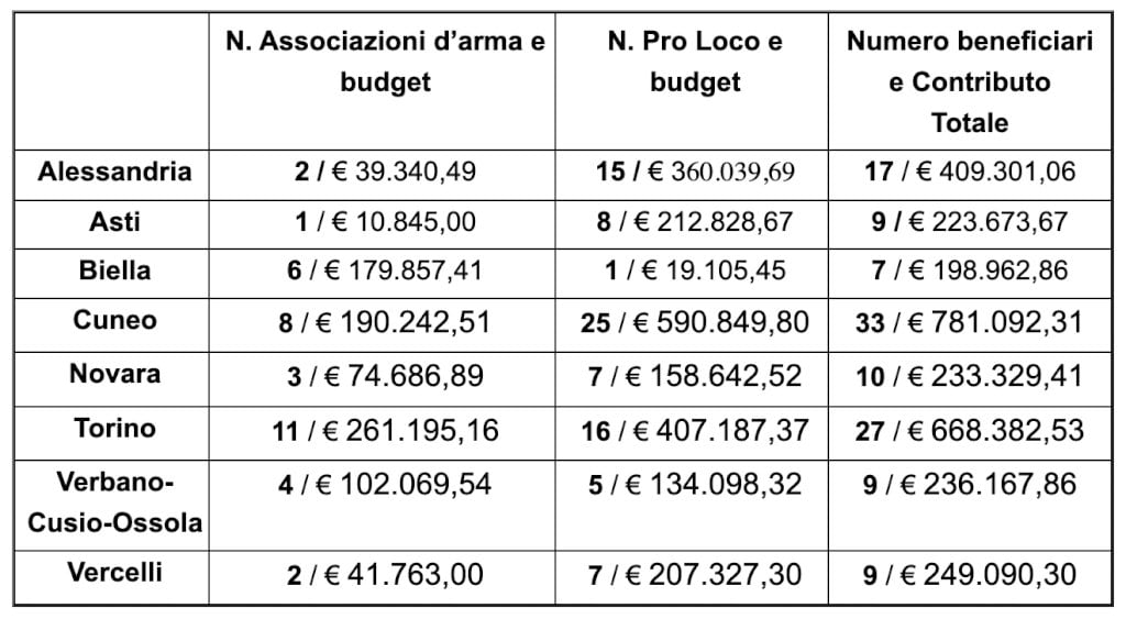 Ora l’arrivo del nuovo contributo da 3 milioni di euro da parte del Cipess (il Comitato interministeriale per la programmazione economica e lo sviluppo sostenibile) ha reso possibile il loro accesso al finanziamento regionale. Esse vanno così a raggiungere le 160 Pro Loco e 78 Associazioni d’arma già finanziate con la prima tranche di contributi dal bando regionale, portando a 358 il totale dei soggetti che beneficiano del sostegno della Regione Piemonte. Questi 3 milioni sono suddivisi in 900mila euro alle Associazioni d’arma e 2,1 milioni alle Pro Loco. Con la nuova tranche, il sostegno della Regione alle Pro Loco e Associazioni d’arma erogato a partire dal 2020 arriva a toccare i 10 milioni di euro.