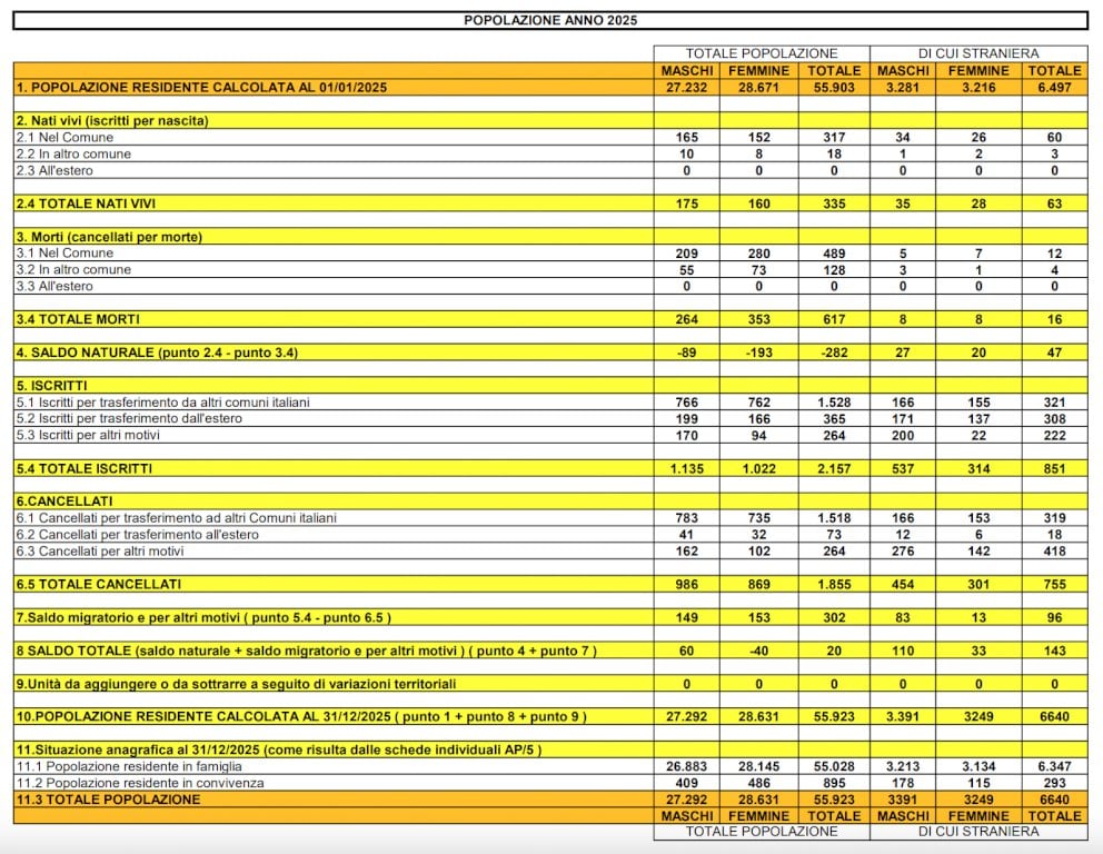 Saldo tra nuovi nati e decessi negativo per 282 unità, ma i trasferimenti da altri Comuni trainano l'aumentoA fine 2025 sono 55.923 i residenti nel Comune di Cuneo: venti in più rispetto all’inizio dell’anno, quando erano 55.903. La popolazione totale è suddivisa in 27.292 maschi e 28.631 femmine. Sale la quota di stranieri: erano 6.497 a inizio anno, oggi sono 6.640. Sono alcuni dei dati demografici diffusi dagli uffici comunali in occasione della fine dell’anno.