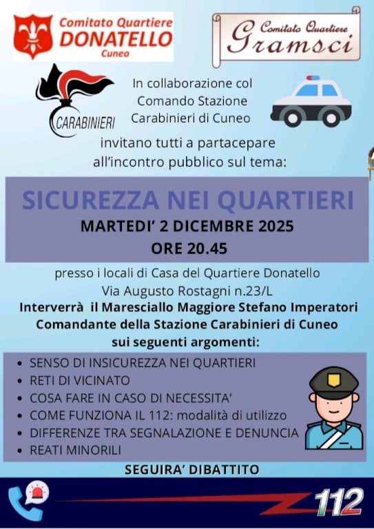 L'iniziativa nella serata di martedì 2 dicembre, presente il comandante della Stazione di Cuneo, Maresciallo Maggiore Stefano ImperatoriMartedì 2 dicembre, alle ore 20:45, presso la Casa del Quartiere Donatello, in via Augusto Rostagni 23/L, ci sarà un incontro pubblico dal titolo "Sicurezza nei Quartieri", organizzato da Comitato di Quartiere Donatello, Comitato Quartiere Gramsci, Comando Stazione Carabinieri di Cuneo.