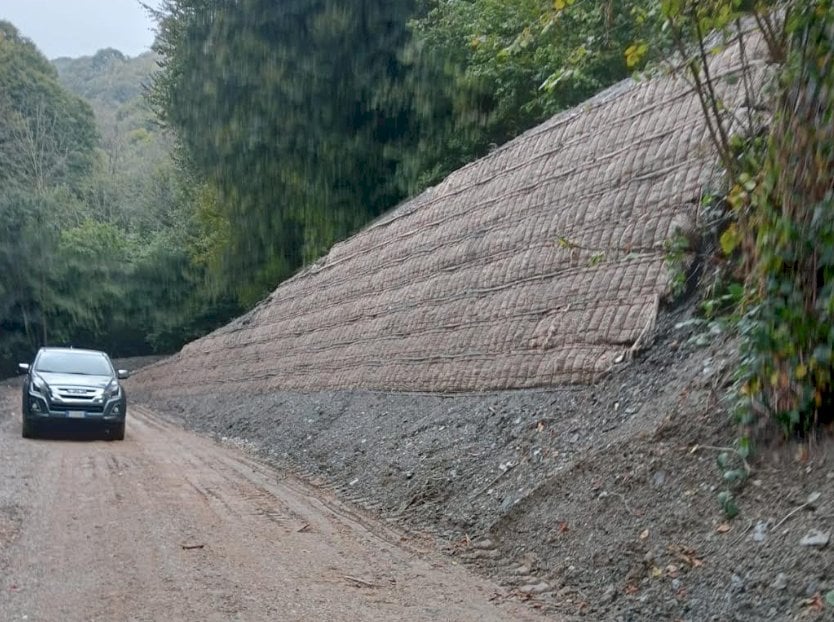 Le opere, realizzate dalla ditta SMT di Cuneo che ha subappaltato parte dei lavori alla ditta F.lli Dalmasso di Isasca, hanno previsto il consolidamento della scarpata mediante la tecnica delle terre rinforzate, una soluzione che ha permesso di unire sicurezza, funzionalità e rispetto del paesaggio. Tale tecnologia utilizza materiali leggeri e facilmente trasportabili, riducendo l’impatto del cantiere sulla viabilità e consentendo di allargare la sede stradale nella rampa di monte per migliorare l’accesso alla pista forestale. Il nuovo rilevato rinforzato, lungo circa 45 metri e con un’altezza variabile da 2,8 a 4 metri, è stato completato con idrosemina per il rinverdimento naturale e con la posa di canalette e tagliacqua per la corretta raccolta e smaltimento delle acque piovane, a tutela della stabilità del fondo stradale. L’intervento, dell’importo complessivo di 80.000 euro, coperto con finanziamento della Regione Piemonte - Settore pronto intervento, ha restituito piena funzionalità e sicurezza alla viabilità comunale di montagna, garantendo la continuità dei collegamenti con le borgate più alte del territorio e migliorando la resilienza del versante a fenomeni erosivi e di instabilità.