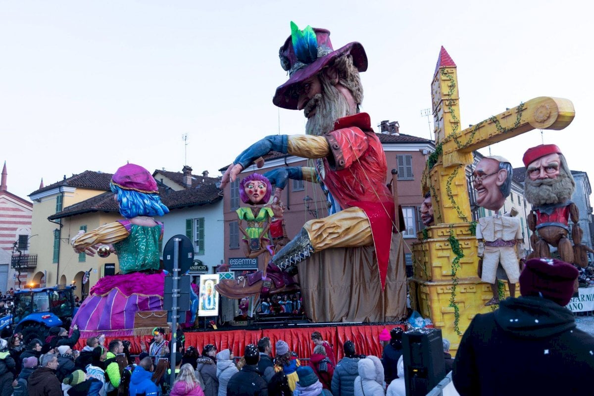 1. Desvela di Scalenghe - “Appesi a un filo”: Il carro rappresenta l’umanità come marionette manovrate da un burattinaio, il tempo, e intrappolate in un sistema chiamato “progresso”. Figure come i topi “Ritardo” e “Fretta” simboleggiano l’ansia, ma il lieto fine vede le marionette spezzare i fili per ritrovare la libertà. Il gruppo è composto da 600 sfilanti.