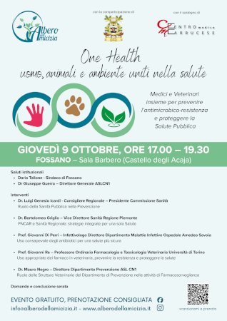 Giovedì 9 ottobre a Fossano un evento aperto a tutti, organizzato dall'Albero dell'Amicizia, per affrontare una delle tematiche più urgenti per la salute pubblicaL’Albero dell’Amicizia organizza a Fossano una serata di grande attualità ed importanza per la salute di tutti: un incontro dedicato al tema dell’antimicrobico-resistenza (AMR), cioè la perdita di efficacia degli antibiotici e di altri farmaci antimicrobici, uno dei problemi più urgenti per la sanità mondiale. Si tratta di un fenomeno che riguarda non solo gli ospedali, ma anche la vita quotidiana di ciascuno di noi: cure mediche più difficili, rischi maggiori negli interventi chirurgici, ripercussioni sull’allevamento, sulla catena alimentare e sull’ambiente. L'evento "One Health: uomo, animali e ambiente uniti nella salute" è fissato per giovedì 9 ottobre dalle ore 17 alle ore 19.30 presso la Sala Barbero del Castello degli Acaja.