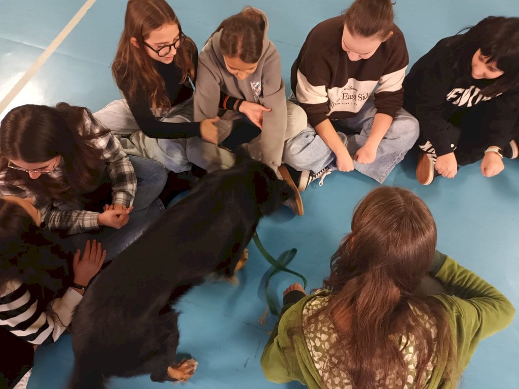 Ogni classe ha poi realizzato un cartellone con disegni e frasi create dagli stessi studenti, che rimarrà appeso in aula come promemoria del percorso svolto. La seconda parte è stata dedicata alle attività con tre cani educati e addestrati per l’interazione con i più giovani: Drama, Baloo e Lara. In ogni incontro uno dei cani ha potuto interagire direttamente con gli studenti, che hanno sperimentato esercizi di ricerca sensoriale, piccoli percorsi di agilità e momenti di osservazione del linguaggio del cane, oltre a semplici attività di cura, come dare da mangiare all’animale. L’entusiasmo è stato generale, con un risultato particolarmente significativo: diversi studenti inizialmente timorosi o dichiaratamente spaventati dai cani sono riusciti, grazie al clima protetto dell’attività, ad avvicinarsi e interagire spontaneamente con tranquillità.