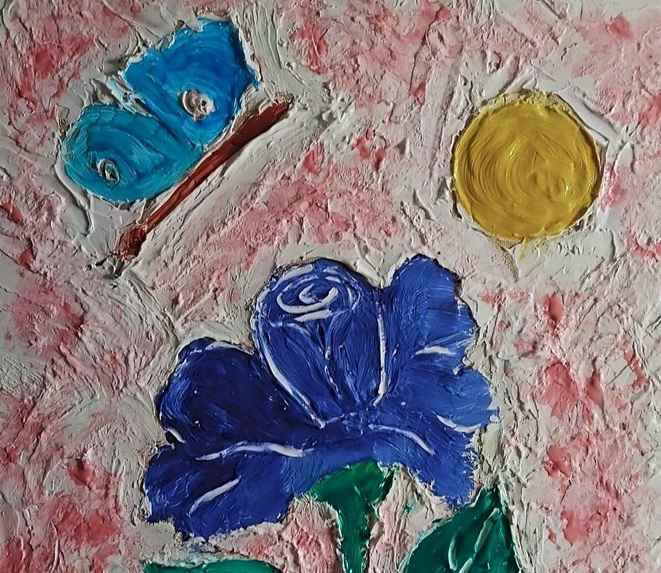 Il riconoscimento è stato assegnato per l’opera “La rosa del cuore” (stucco su tela e spatola), un lavoro che racchiude alcuni degli elementi più rappresentativi della sua produzione. Al centro della composizione emerge una rosa blu, accompagnata da simboli ricorrenti come il sole, il cuore e la farfalla. Si tratta di immagini che ritornano con continuità nelle sue opere e che contribuiscono a definire uno stile personale, riconoscibile e coerente nel tempo.