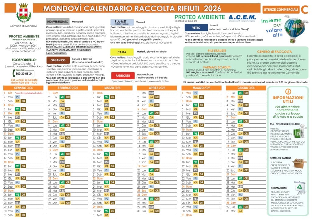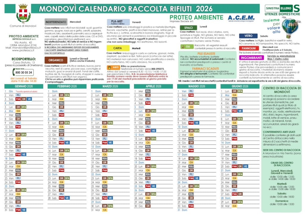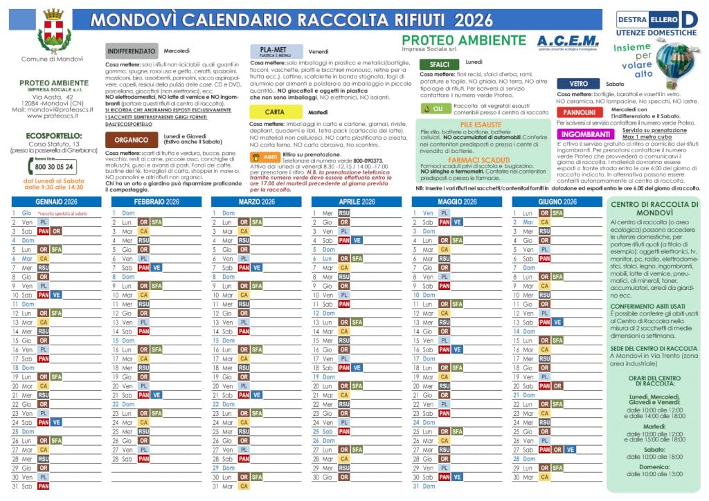 Tre, come sempre, le utenze previste: commerciali, domestiche alla destra dell’Ellero e domestiche alla sinistra dell’ElleroA partire da martedì 30 dicembre sarà disponibile, presso l’Ecosportello di corso Statuto 13, il nuovo calendario di raccolta rifiuti valido fino al 30 giugno 2026 a Mondovì. Tre, come sempre, le utenze previste (commerciali, domestiche alla destra dell’Ellero e domestiche alla sinistra dell’Ellero) con modalità e tipologie di raccolta similari al passato. In proposito, si ricorda che i rifiuti indifferenziati (RSU) dovranno essere conferiti utilizzando esclusivamente i sacchetti semitrasparenti grigi forniti dall’Ecosportello stesso, pena il mancato ritiro da parte dell'operatore e la segnalazione per le verifiche del caso. Per eventuali informazioni: [email protected]; numero verde (dal lunedì al sabato dalle ore 9.30 alle ore 14.30) 800300524.