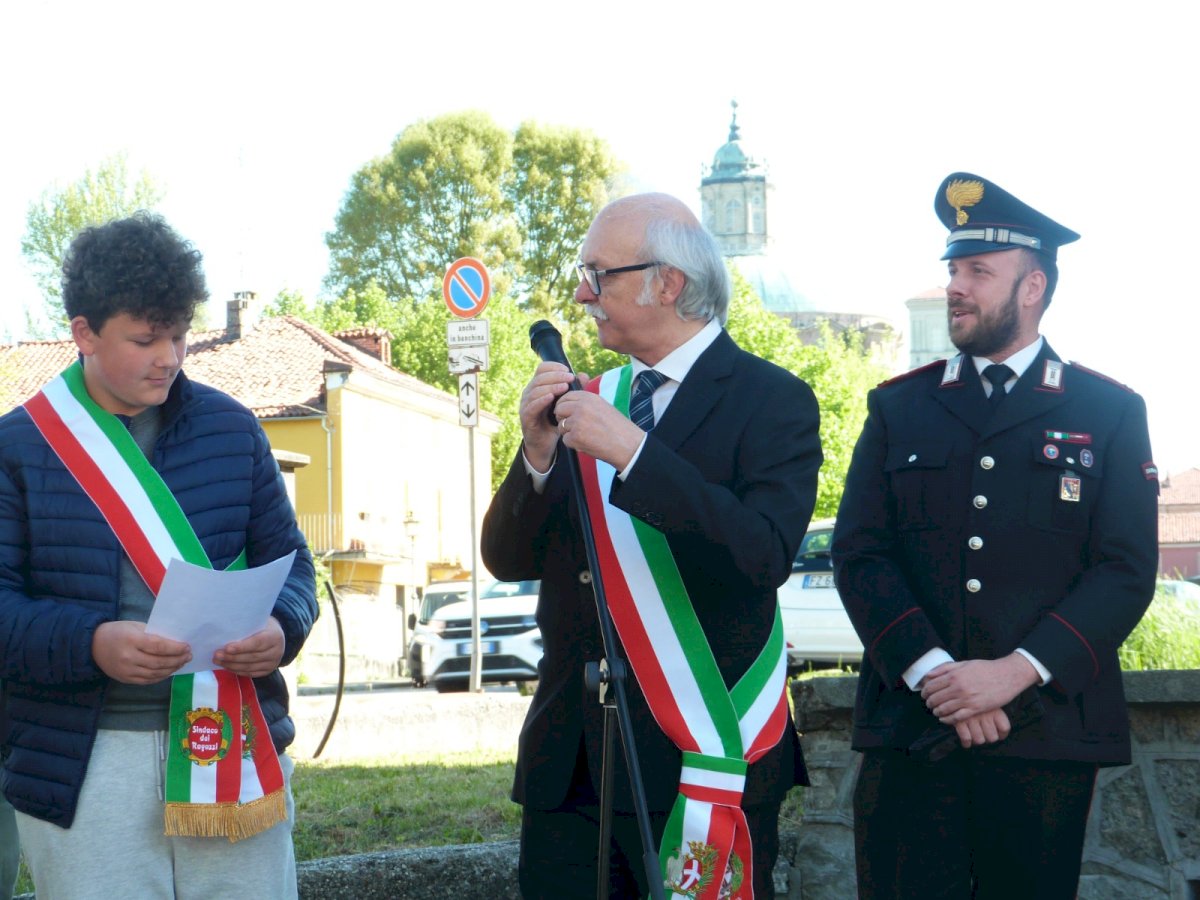 Le commemorazioni sono proseguite con gli interventi istituzionali: il sindaco Gasco ha sottolineato l’importanza di mantenere viva la memoria storica, seguito dal primo intervento pubblico del sindaco dei ragazzi, Francesco Ballattore, che insieme ad alcuni alunni delle scuole locali ha richiamato il valore della libertà e il significato della sua conquista.