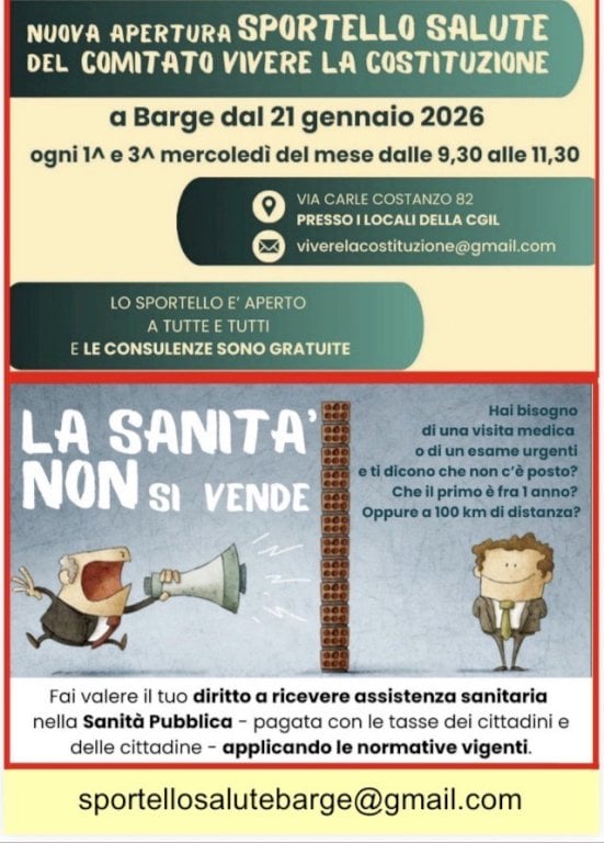 Gestito da volontari, sarà arrivo inizialmente il primo e il terzo mercoledì di ogni meseApre il prossimo mercoledì 21 gennaio a Barge un nuovo Sportello Salute del Comitato Vivere la Costituzione. Lo sportello (costituito unicamente da volontari) si propone di aiutare le persone in difficoltà a causa delle lunghe liste di attesa sulla sanità, utilizzando le leggi vigenti. Non avrà alcun intento di sostituirsi al CUP, ma unicamente di illustrare alle persone il percorso legale per far valere i propri diritti.