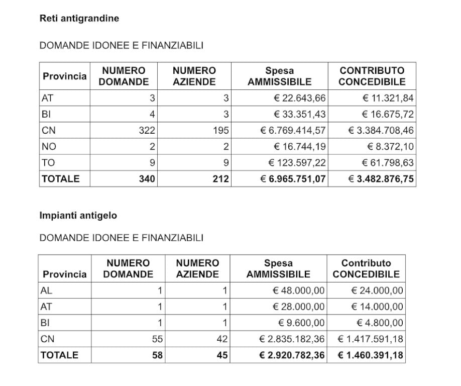 I due interventi sono finanziati con risorse del Csr (Complemento di sviluppo rurale) 2023-2027 e hanno l’obiettivo di rafforzare la resilienza delle aziende agricole piemontesi di fronte agli effetti sempre più estremi dei cambiamenti climatici. Il primo intervento  finanzia investimenti per la prevenzione dei danni di tipo cosiddetto “abiotico”, ossia non provocato da esseri viventi, con particolare riferimento alla protezione delle colture frutticole e viticole dai fenomeni legati alla grandine: finanzia con 3,5 milioni di euro 340 interventi richiesti da 257 aziende che potranno così acquistare e porre in opera reti e dispositivi antigrandine. Il secondo intervento è dedicato all’acquisto e alla messa in opera di ventilatori e bruciatori antibrina destinati alla protezione delle colture dai danni da gelate tardive. Sono state dichiarate idonee e finanziabili 58 domande presentate da 45 aziende piemontesi per un contributo complessivo di circa 1,5 milioni di euro. In entrambi i casi il contributo della Regione copre il 50% della spesa ammissibile con un’erogazione massima fino a 75mila euro. Ulteriori domande idonee saranno sostenute qualora si rendano disponibili nuove risorse, come attraverso il recupero di somme non spese o rinunce.