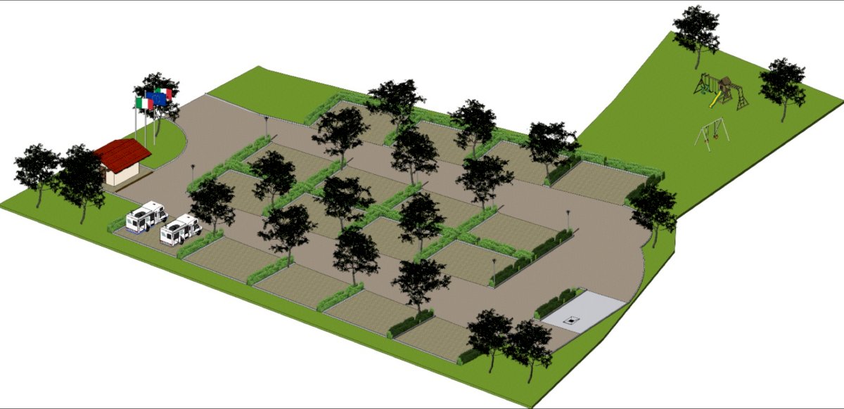 Le piazzole, pavimentate con autobloccanti drenanti, avranno dimensioni di 10 metri x 8 e saranno disposte a coppie, delimitate da siepi e ombreggiate con alberature di medio e alto fusto. Saranno disponibili allacciamenti per acqua ed energia elettrica, oltre al punto di scarico per acque grigie e nere. Il progetto prevede anche un futuro fabbricato servizi con wc, docce, lavabi e area lavaggio stoviglie, non compreso nei lotti iniziali. Sul lato verso il torrente verranno inoltre predisposti circa 700 metri quadrati di area verde con giochi per bambini e zone picnic.