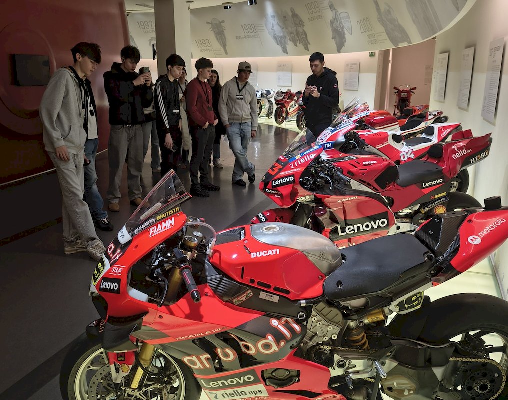 Oltre ad ammirare i centri storici delle due città, la gita è stata arricchita da visite aziendali legate al percorso tecnico delle classi. All’acetaia “Cà dal Non” di Vignola è stato illustrato il processo produttivo pluridecennale del Balsamico Tradizionale, con degustazione guidata delle varie fasi del prodotto dop. In seguito, alla Ducati, i tutor hanno accompagnato gli studenti in un lungo percorso di osservazione delle linee di montaggio motori e di finitura estetica, per poi testare nel laboratorio interattivo “Fisica in moto” le forze che agiscono sulla guida in strada e in pista. Infine, la terza eccellenza emiliana visitata è stata l’officina-museo di Enzo Ferrari, dov’è in corso l’esposizione delle auto di proprietà di grandi star della musica presenti e passate.