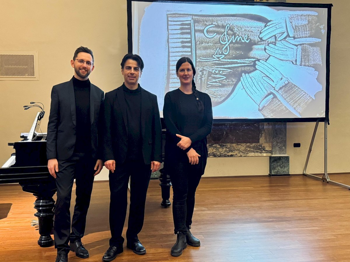 Protagonisti dell’evento i pianisti Lorenzo Martini e Andrea Vigna-Taglianti, che hanno accompagnato il pubblico in un percorso musicale raffinato e coinvolgente, dialogando con le immagini create dal vivo dalla sand artist Nadia Ischia. Granello dopo granello, le sue figure di sabbia hanno preso forma sullo schermo seguendo il respiro della musica, trasformando ogni brano in una piccola storia da guardare e da ascoltare.